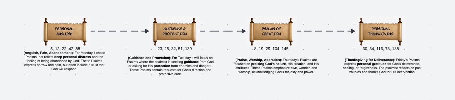 This cycle—moving from anguish to awe—is woven throughout the Book of Psalms, appearing again and again as a pathway for those struggling in the darkest places. My hope is that through our exploration together, this pattern might offer a template, a way forward not only for ourselves but also for others who wrestle with similar demons. If these ancient words can reach us, reminding us we’re not alone, perhaps they can be a light for others as well.